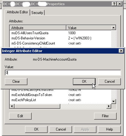 Scroll down the list of attributes until you find ms-DS-MachineAccountQuota. Click Edit to modify the value.