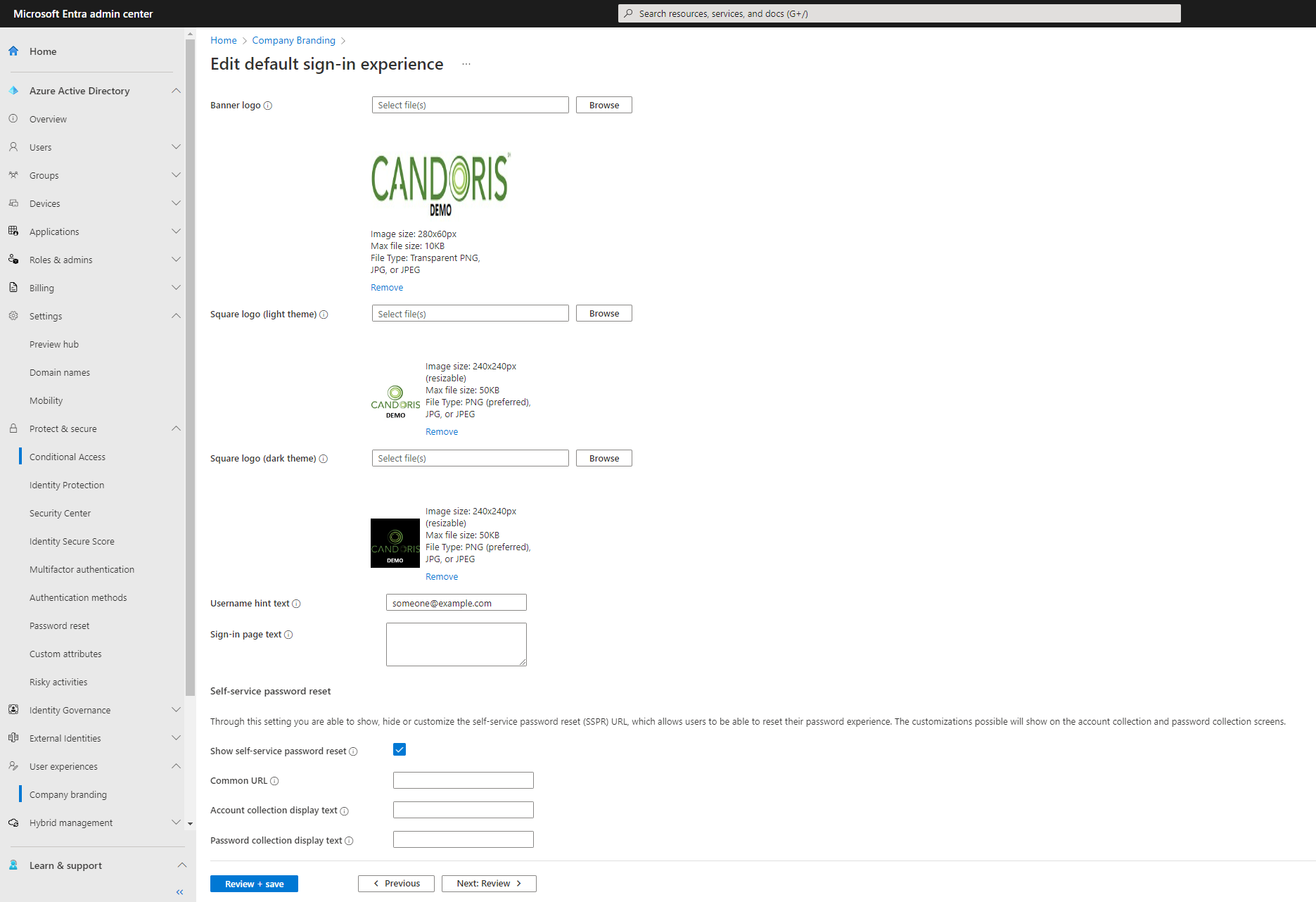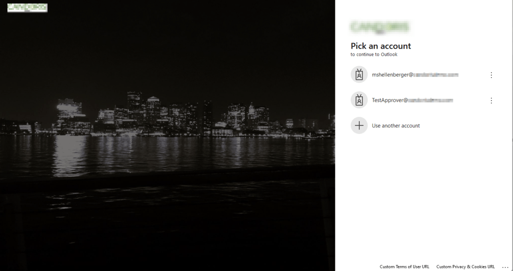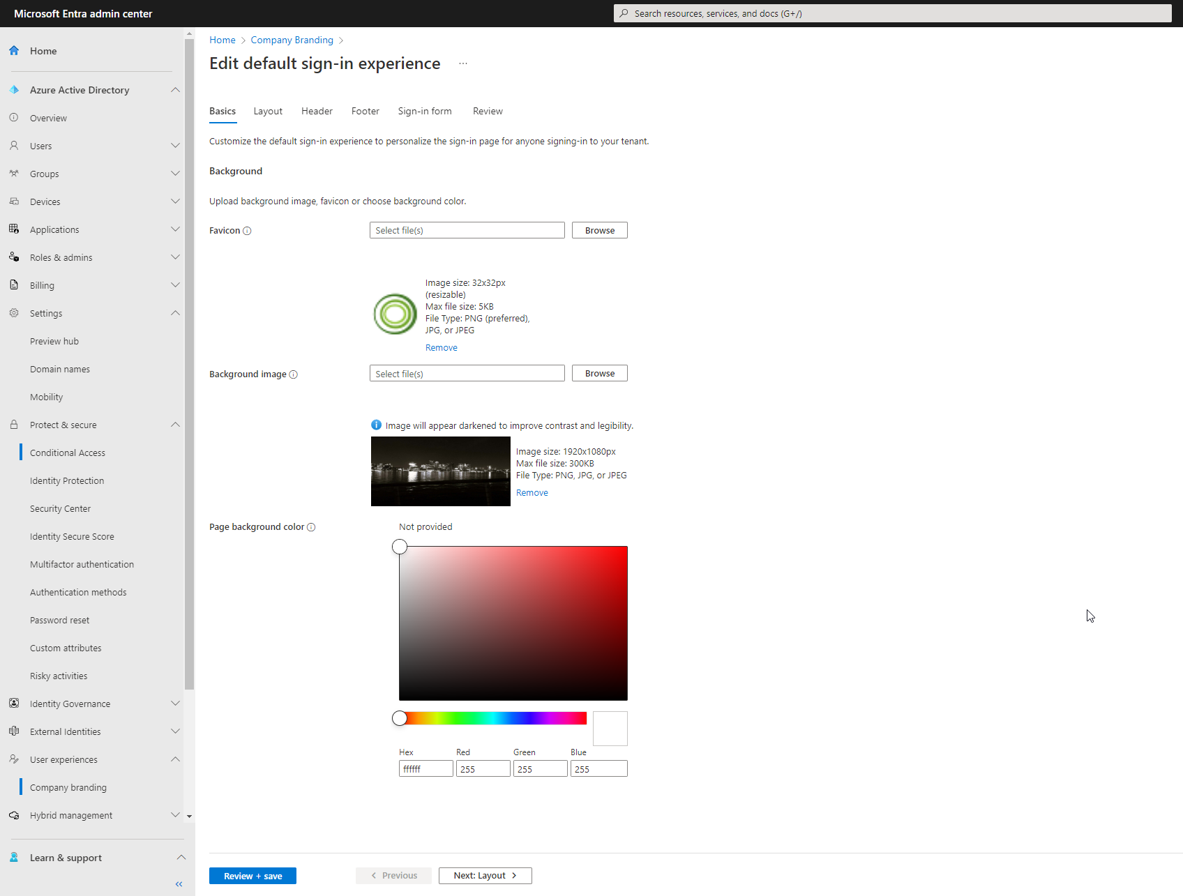 As you can see, there is now a header logo in the upper left, a background image that’s shown in the traditional “partial-screen” layout, and custom links for terms of use and privacy in the lower right. With some time and effort on the custom CSS (which I did not have time to do here), you could really change the entire sign in experience to follow organization branding guidelines. Let’s walk through the admin portal experience together to see how we enable the new enhanced company branding settings.