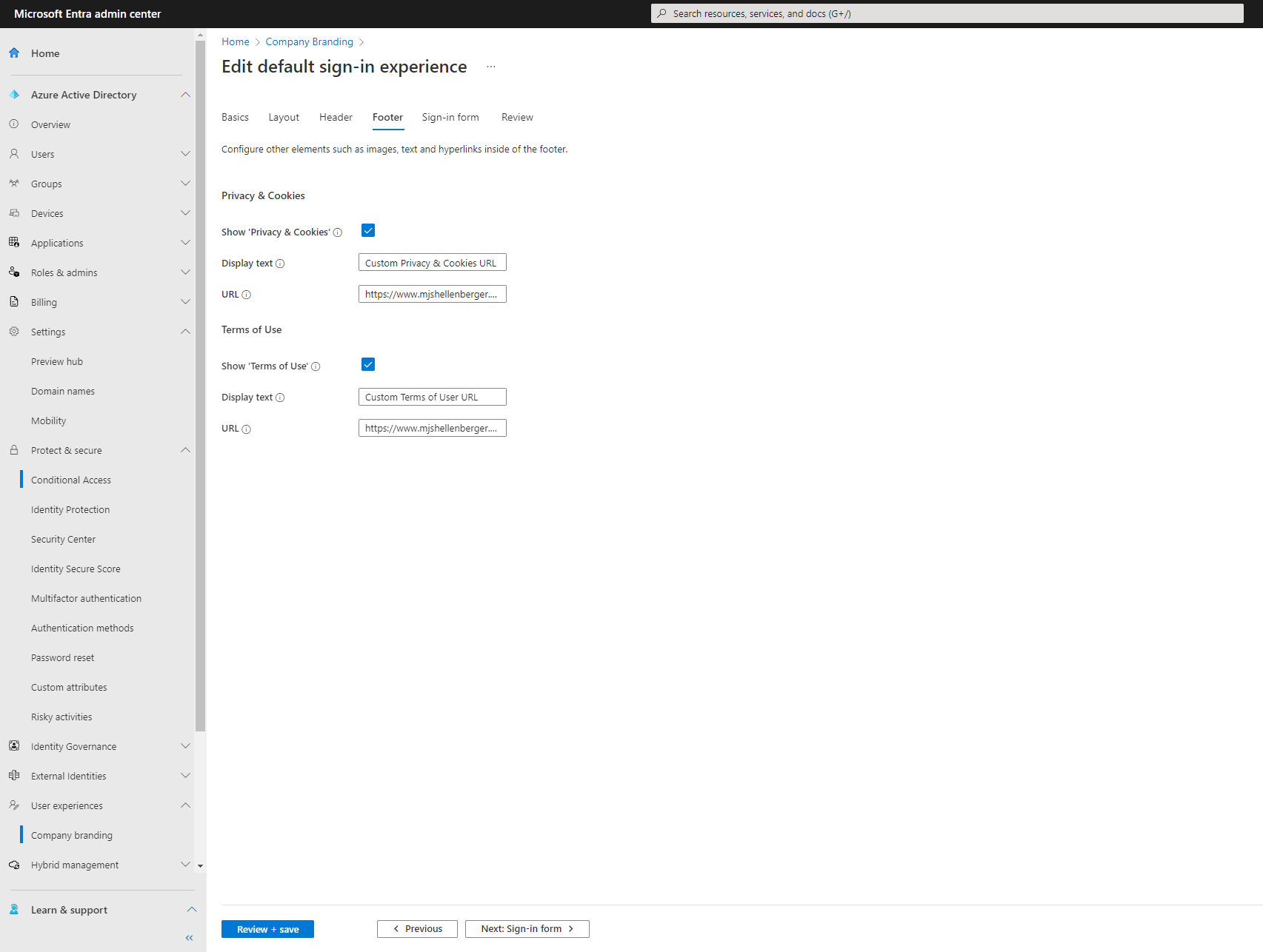 Click Next: Sign-in form > to continue to the last editable page of the wizard. On this page you’ll find the traditional company branding options such as logo’s, username hint text (highly discouraged from a security perspective), and sign-in page text. There is an option to show or hide the self-service password reset link, which has existed for some time, but something new here is the option to modify the link text and destination URL. If your organization leverages a third-party password reset tool for Active Directory, this option gives you a good opportunity to now link and redirect users to the solution instead of users trying to run through the Azure AD SSPR and receiving an error message since AAD SSPR isn’t enabled for your tenant.