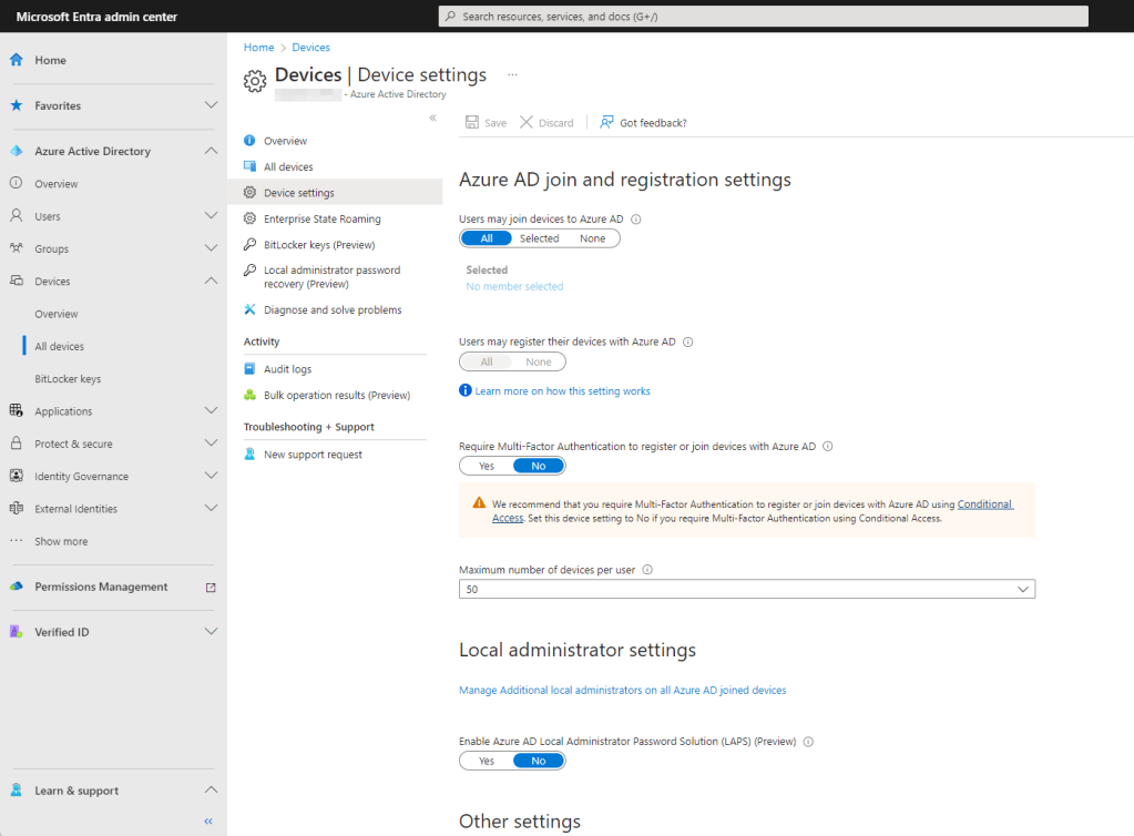 - Open the Entra admin console. Expand the Azure Active Directory section, then click All Devices. On the management blade that opens, click Device Settings.
