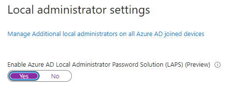 2. Under Local administrator settings, click Yes on the toggle switch for Enable Azure AD Local Administrator Password Solution (LAPS) (Preview).