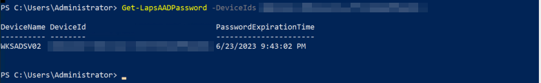 5. You can now manually retrieve the Windows LAPS information for an individual device by running the cmdlet: Get-LapsAADPassword -DeviceIds [DeviceIDFoundInAzureAD]