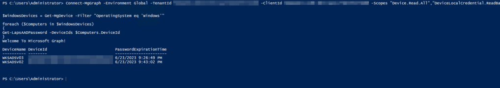 6. To return all devices that have escrowed local admin passwords to Azure AD, try the following script after connecting to MSGraph via the previous steps: