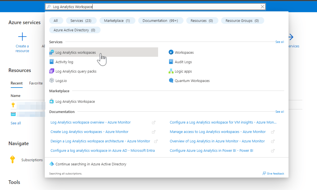 - In the search bar at the top, type Log Analytics Workspace and select when it appears in the search results.