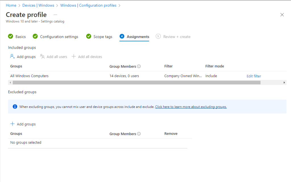 6. Add the appropriate groups to target devices for the telemetry settings. In my case, I am targeting a group that contains all Windows computers in my environment. I’m then refining my scope with a filter that includes only company owned Windows endpoints. Click Next, once complete.