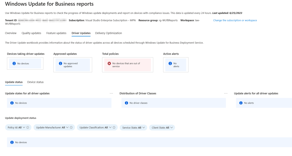 Once deployed, you can expect to see high-level and detailed data on the overall state of Windows updates compliance in your organization. At present, there are five tabs that display in the workbook once the solution has ingested client telemetry data: