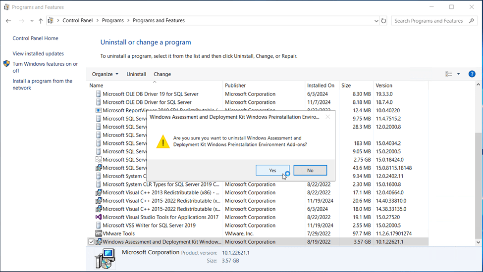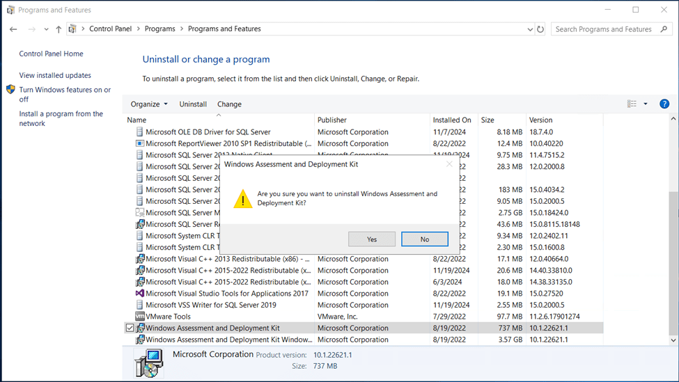 Next, make sure the Windows Assessment & Deployment Toolkit (ADK) is up to date on your site server. As of the posting of this article, 10.1.26100.1 – May 2024 is the latest version. The following steps walk through the process of updating the Windows ADK on the site server: