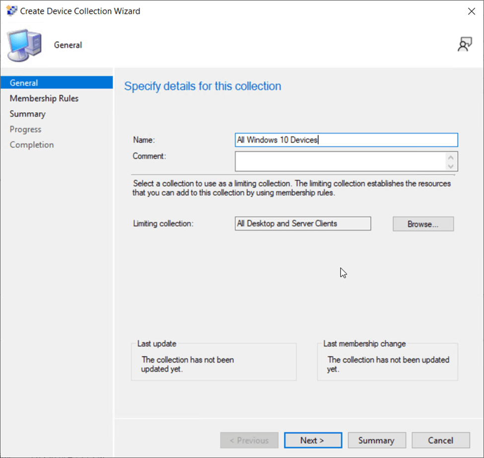 - Specify a Name (Clients Ready for Upgrade to Windows 11 23H2) and Comment. Choose a limiting collection of All Windows 10 Devices (collection we just created in previous steps) then click Next.