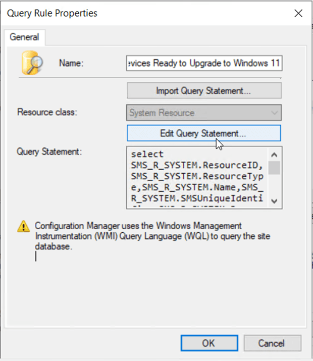 - Provide a name for the query such as “Devices Ready to Upgrade to Windows 11”, then click Edit Query Statement.
