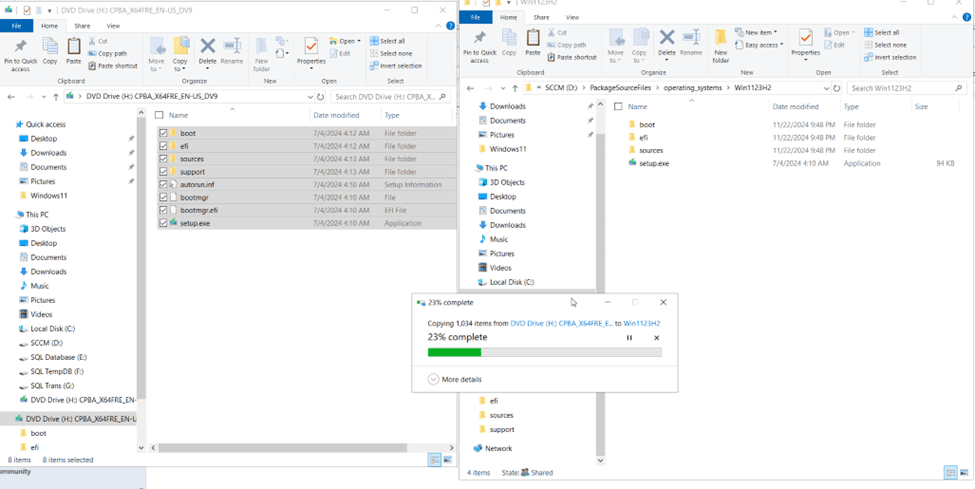 - Mount the Windows 11 23H2 ISO media and extract (copy/paste) all files to a network share accessible to Configuration Manager. In this example, I have a share named “PackageSourceFiles” I will copy the contents of the ISO to.