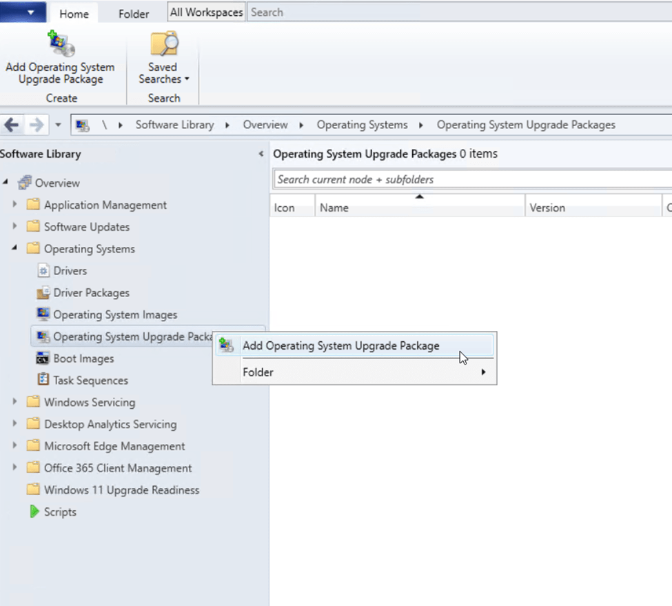 - From the Configuration Manager console, navigate to Software Library > Operating Systems > Operating System Upgrade Packages.
