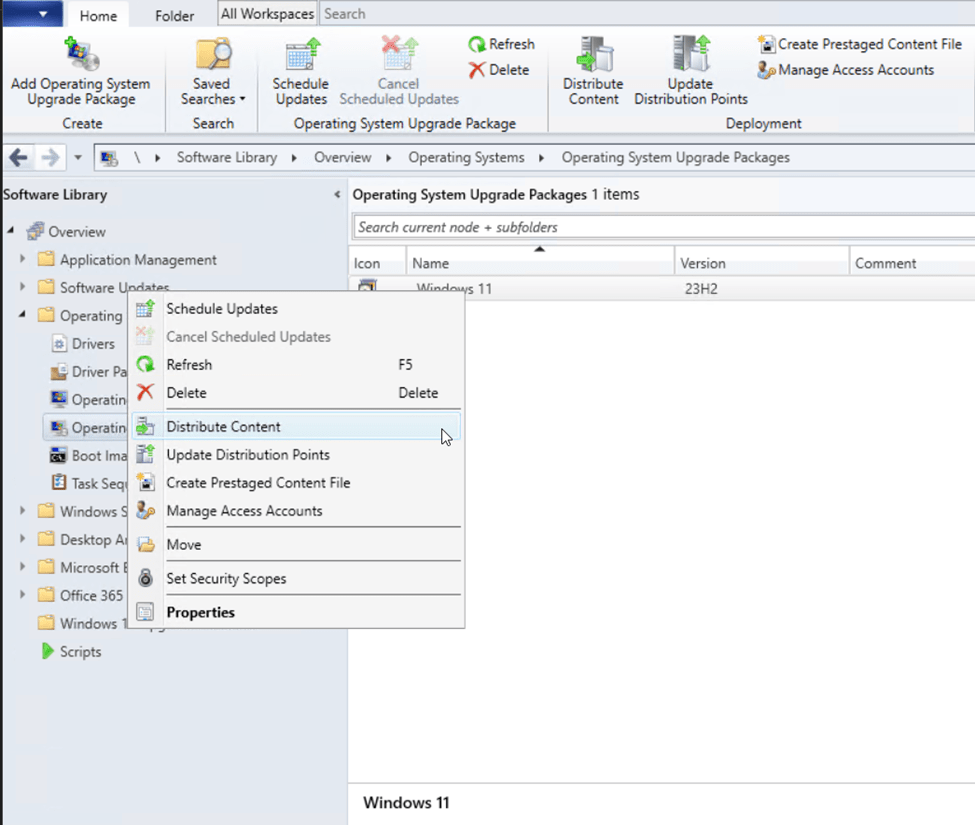 - Right-click the newly created operating system upgrade package, then select Distribute Content to deploy the bits to your distribution points.