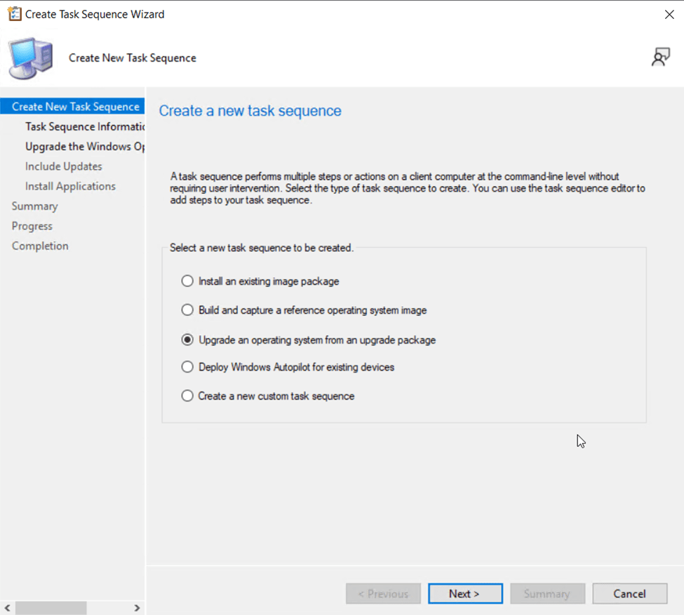 - Review the configuration settings you’ve made on the summary screen, then click Next to finish the creation of the upgrade task sequence.