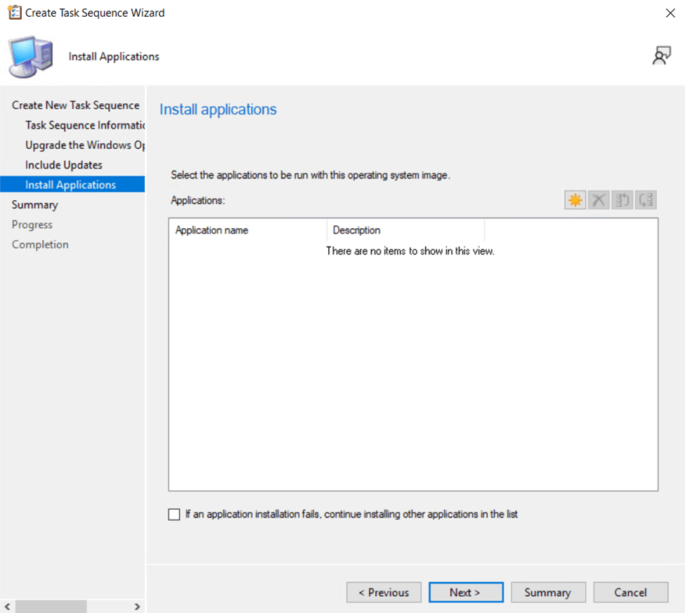 - On the Install Applications page of the wizard, select any New applications that should be installed during the upgrade process. Existing applications that are already installed on the client will remain. Click Next to proceed to the summary screen.