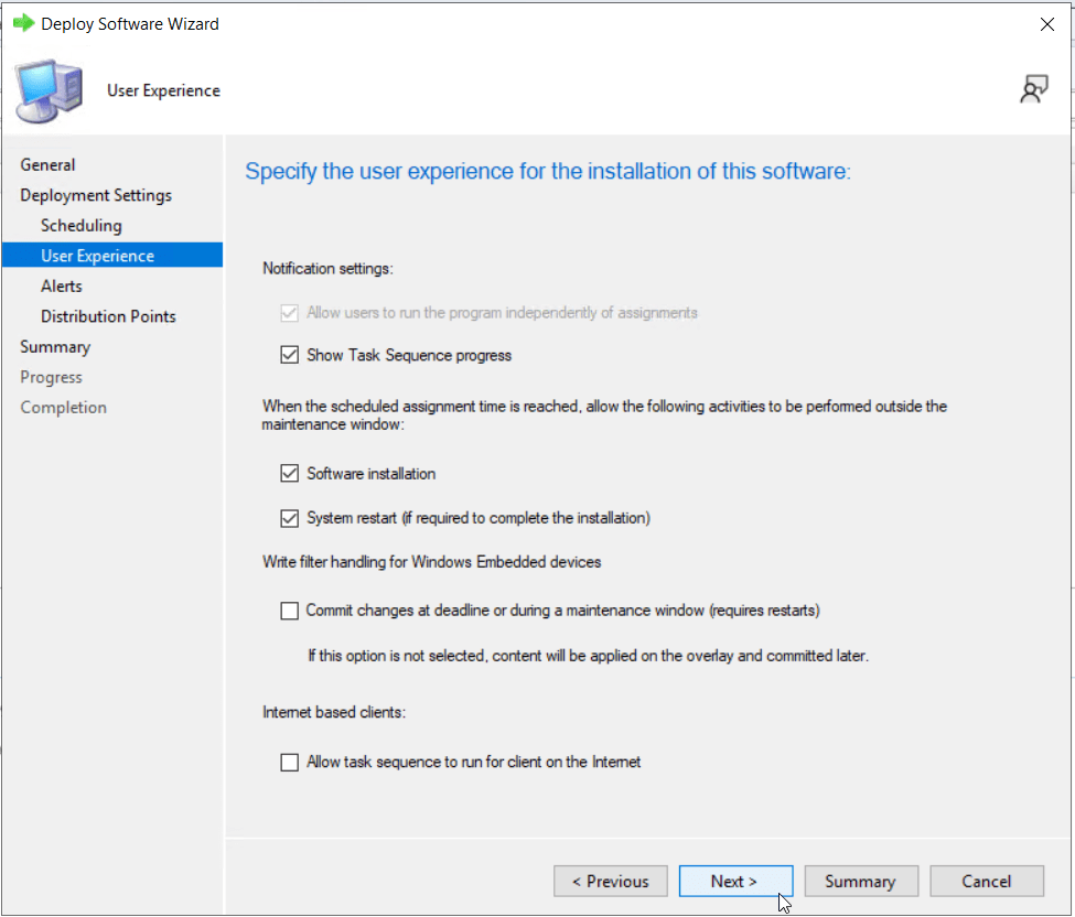 - On the user experience tab, select the various options for the experience you desired for your user base. I choose to display the task sequence progress for users and allow the deployment to perform software installation and system restarts outside maintenance windows as the user will already be choosing a convenient date/time for installation when they click and run the upgrade task sequence. Click Next.