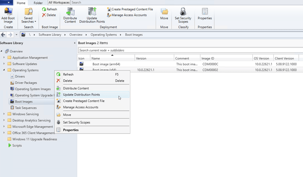 - From the Configuration Manager console, Software Library > Operating Systems > Boot Images. Right-click on Boot Image (x64) and click Update Distribution Points.