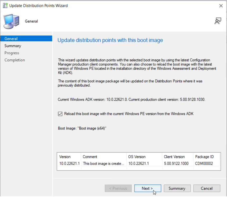 - Select the checkbox Reload this boot image with the current Windows PE version from the Windows ADK, then click Next.