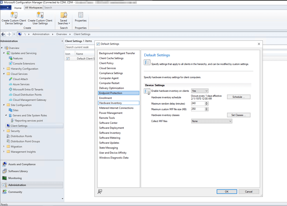 - First, ensure clients are reporting hardware inventory information by verifying client settings in the Configuration Manager console: Administration > Client Settings