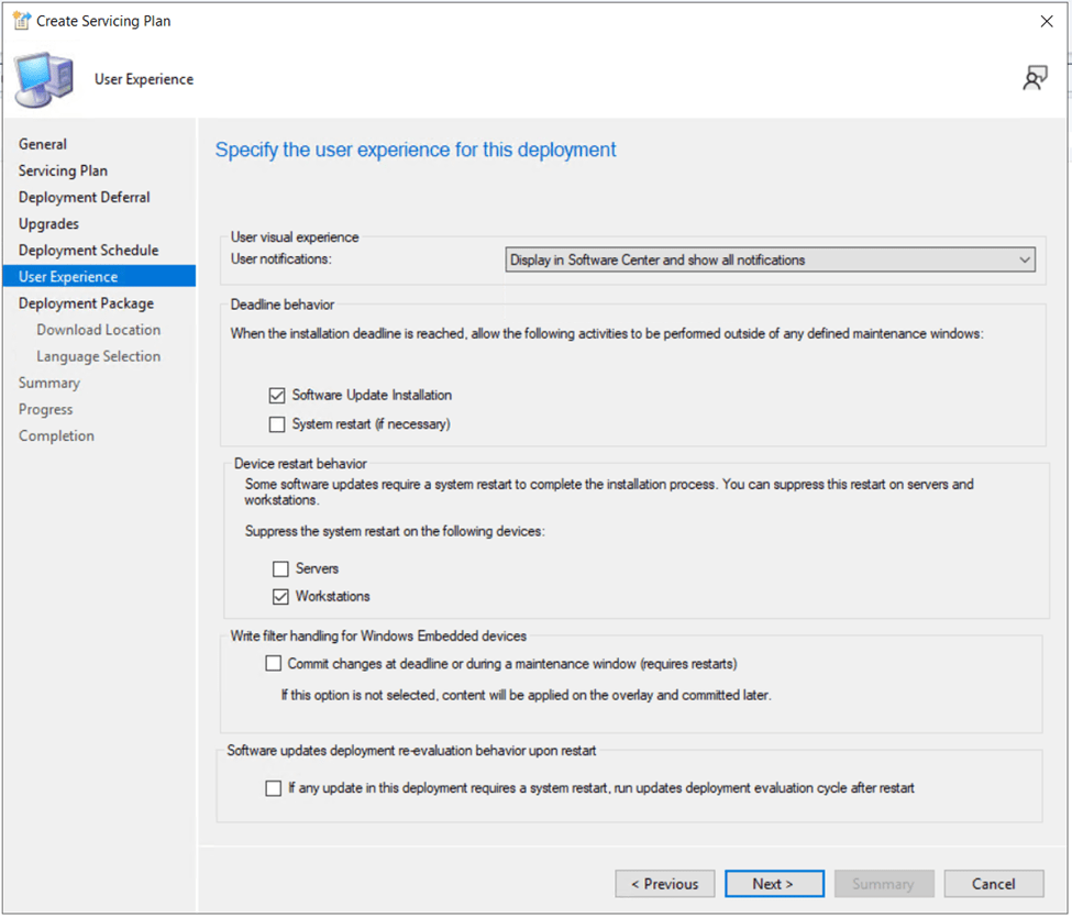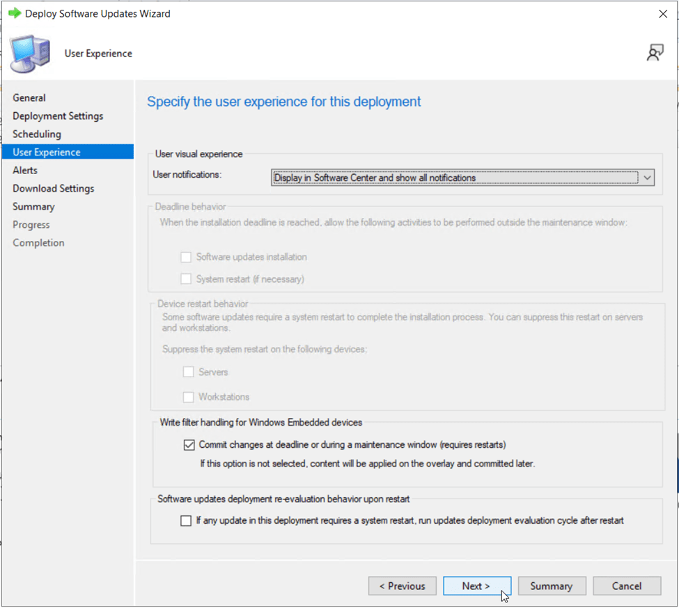 On the User Experience page, change the user notifications to Display in Software Center and show all notifications. This allows the Windows 11 23H2 update to show up for the user in Software Center. Set the deadline behavior to allow Software Update Installation to occur outside of maintenance windows. This will ensure when the installation deadline arrives, the update won’t wait for the next maintenance window to apply. It is also a good idea to check the box for Workstations under “suppress the system restart” so devices are not automatically restarted when an installation deadline occurs.