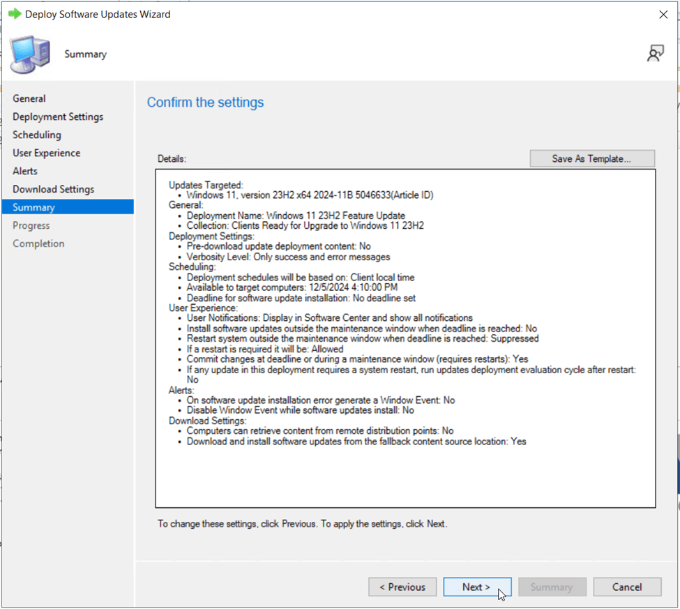 On the Deployment Settings page, set the type of deployment to Available. This will publish the Windows 11 23H2 update to users via Software Center where they can pick a date/time that works for them to perform the upgrade. As your Windows 11 upgrade deadline approaches, this can be transitioned to a “Required” deployment to force remaining users through the upgrade.