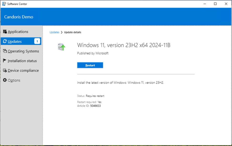 You can now monitor the deployment of the Windows 11 23H2 update to users from the deployments page. Users should begin to see the Windows 11, version 23H2 x64 2024-11B update show up in Software Center on their devices under the Updates section the next time the device checks in and retrieves the new deployment.