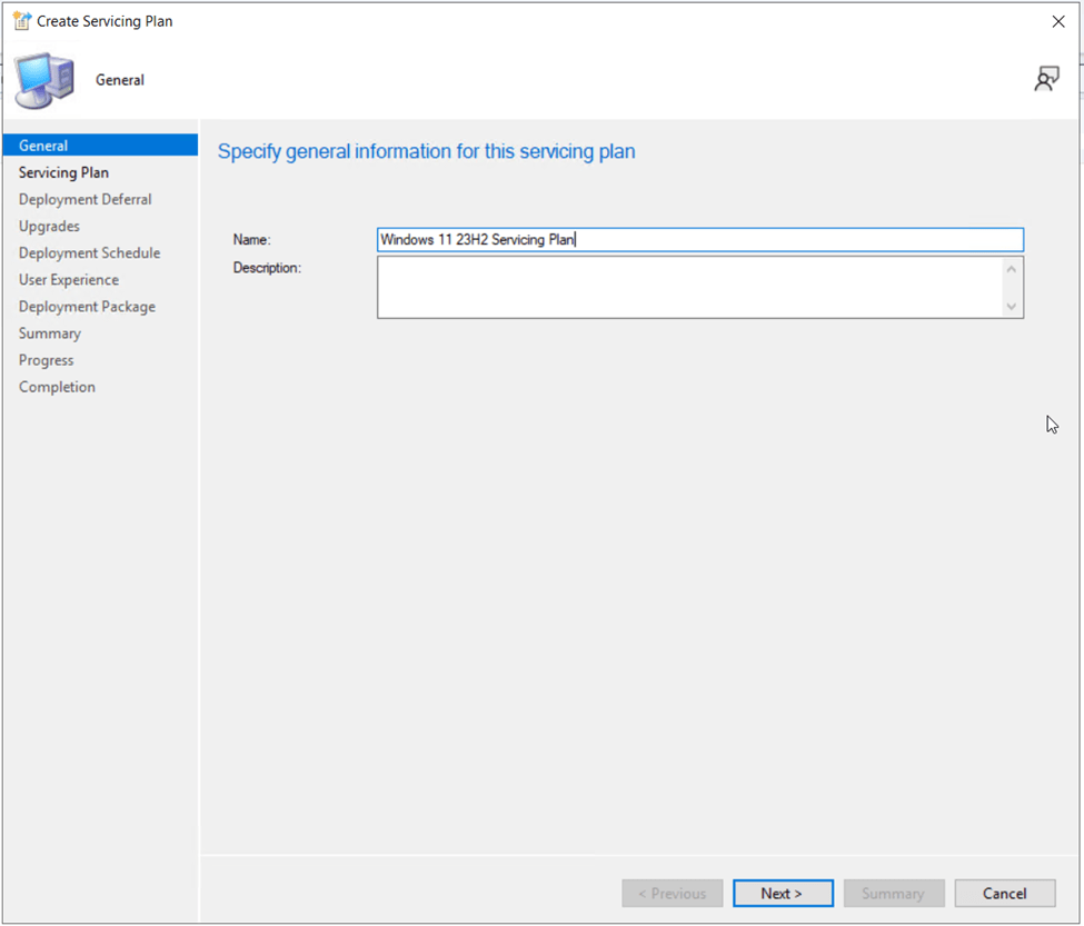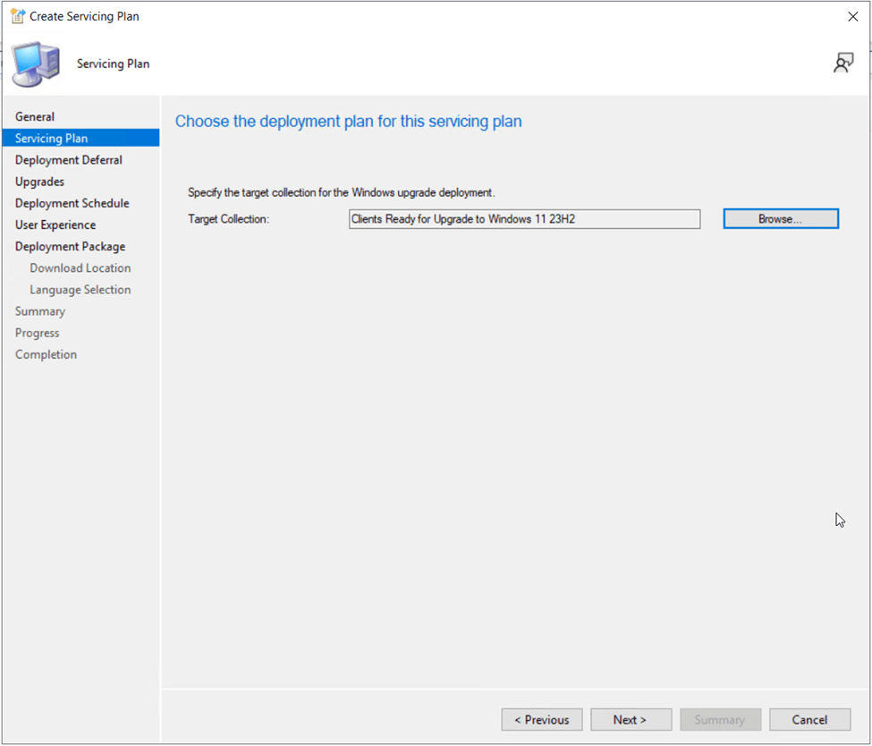 On the Servicing Plan page of the wizard, specify the Target Collection for the upgrade. Specify a pilot collection of Windows 11 23H2 ready client devices (We created this earlier in the preparation steps, “Clients Ready for Upgrade to Windows 11 23H2”).