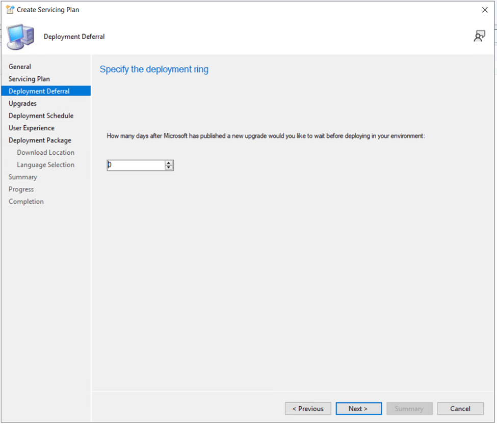 On the Deployment Deferral page, I am going to leave the deferral days at 0 as 23H2 came out over a year ago and I wish to immediately deploy it.