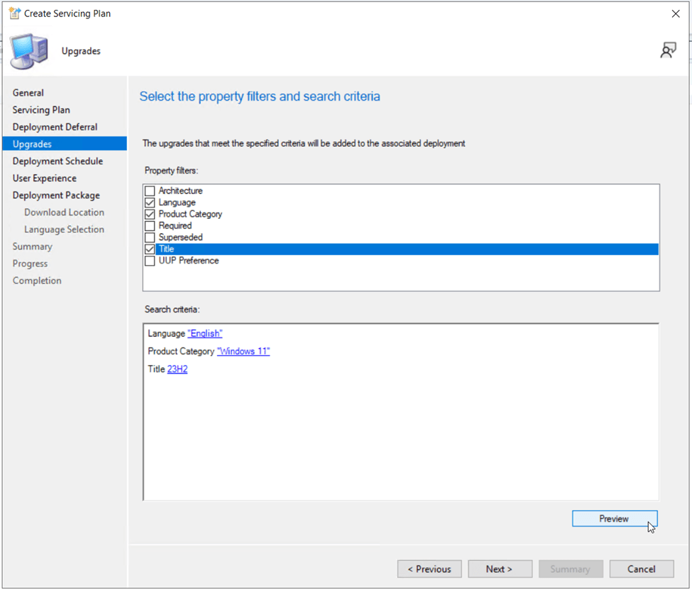 On the Upgrades page, specify the criteria to search for the Windows 11 23H2 update. I will use Language: English, Product Category: Windows 11 Title: 23H2. Click the Preview button to display the results.