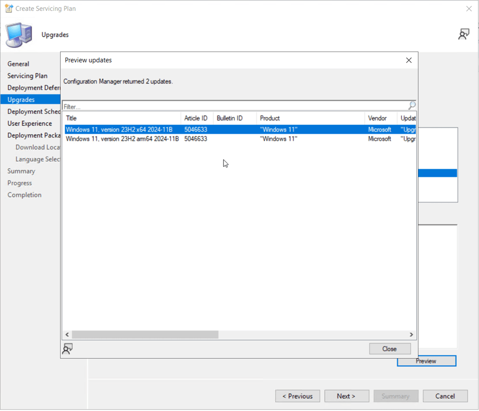 Now that I see there are two matching updates in my search results, I need to refine my search criteria so that I’m only deploying the x64 version of the update as I have no ARM based devices in my lab. I’ll copy the exact title of the update: “Windows 11, version 23H2 x64 2024-11B”, then close the preview window.