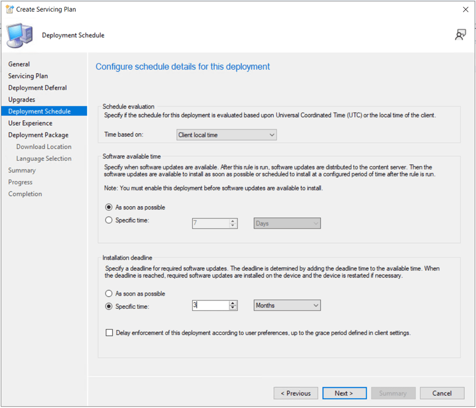 On the Deployment Schedule page, we need to set the time the update will be made available to client devices as well as a deadline when the update will automatically apply to the device. I’m leaving the software available time set to As soon as possible and changing the installation deadline to 3 months as I want users to be able to optionally self-service the update first before I enforce the upgrade 3 months from now.