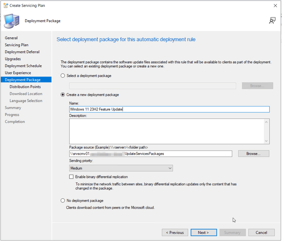 On the Deployment Package page, choose the option to Create a new deployment package. Give the package an appropriate name, such as “Windows 11 23H2 Feature Update”, a Description, and specify the location of your network accessible software update package source files.