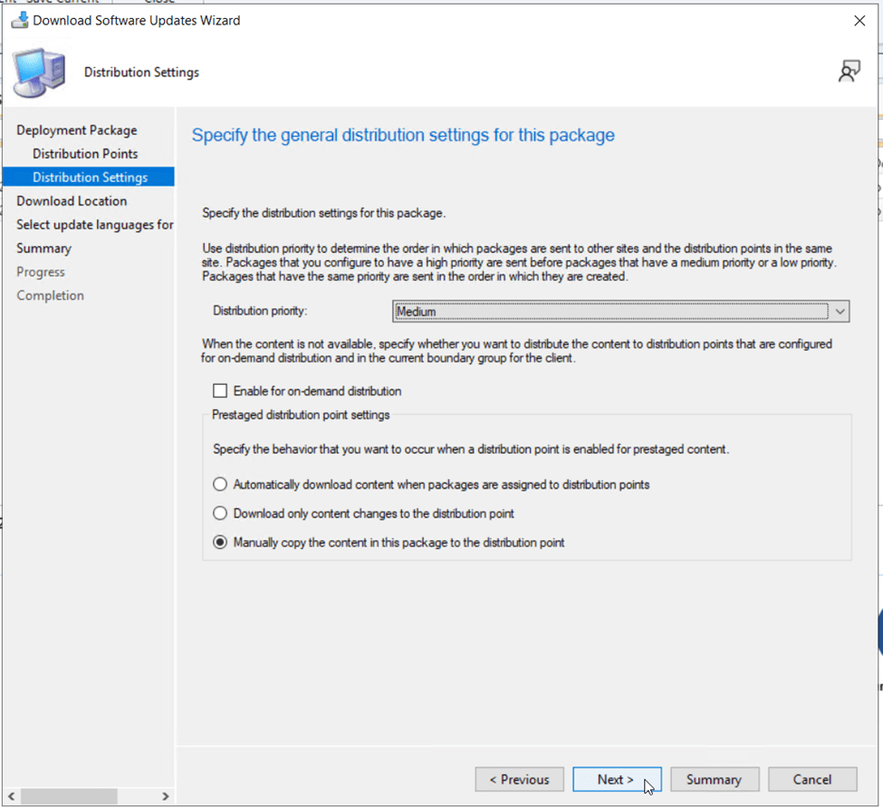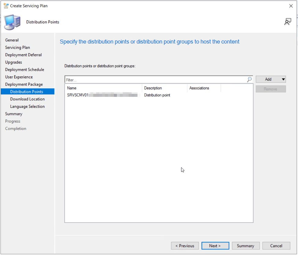 On the Distribution Points selection page, click Add then specify which distribution points, distribution point groups and cloud management gateways (if applicable) the update will be stored on for distribution to clients.