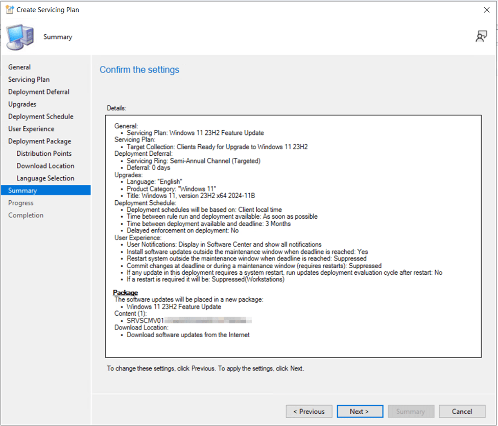 Verify all settings on the summary page, then click Next to commit the servicing plan deployment.