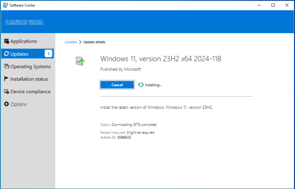 You can now monitor the deployment of the Windows 11 Update to users from the servicing plans page. Users should begin to see the Windows 11, version 23H2 x64 2024-11B update show up in Software Center on their devices under the Updates section, the next time the device checks in and retrieves the new deployment. This may take some time as the update needs to be downloaded, distributed to the distribution points and the client devices need to check in to receive their assignment.