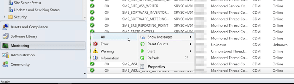 To check the status of the Service Connection Point, open the Configuration Manager console, then navigate to Monitoring > System Status > Site Status. Look for the Service Connection Point role and validate the health status is green. If the health status is not green, proceed to open the Configuration Manager Status Message Viewer and review the most recent entries for troubleshooting.
