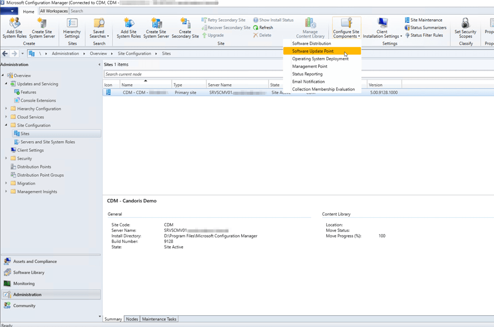 First, we will configure the Software Update Point to synchronize the Upgrades classification of update files. To do this, open the Configuration Manager console, then navigate to Administration > Site Configuration > Sites. Click to highlight the site, then select the Configure Site Components button in the actions ribbon. From the drop-down menu, select Software Update Point.
