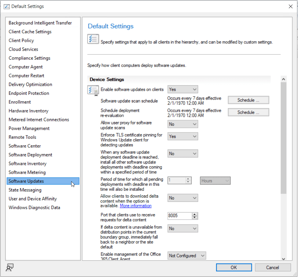 Note: I only have the Default Client Settings in my lab, but you may (and should, per industry recommendations) have multiple iterations of settings deployed to different device collections. Ensure when you edit the settings that will impact your Windows 10 clients, you are impacting the right assets and that you do not miss any devices.