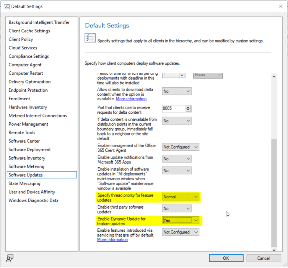 - Find the setting named Enable Dynamic Update for feature updates and set the value to Yes.