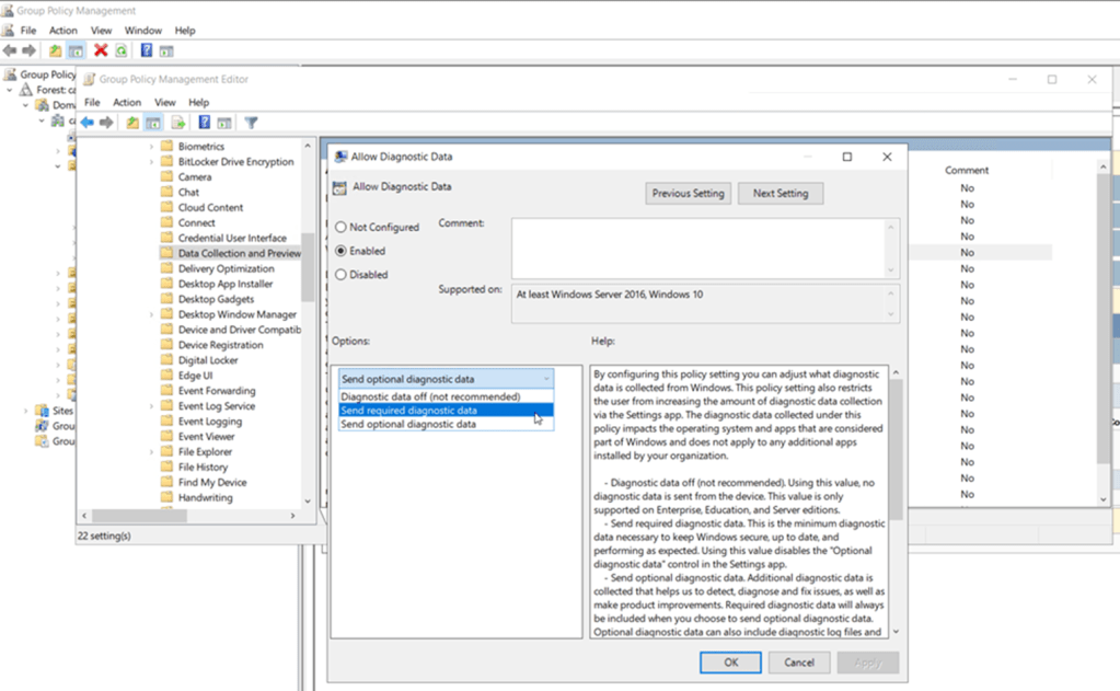 If Windows 10 clients are not already configured to provide at least basic telemetry data, use Active Directory domain-based group policy to enable the configuration at scale. Computer Configuration > Policies > Administrative Templates > Windows Components > Data Collection and Preview Builds > Allow Diagnostic Data > Allow Diagnostic Data. Configure value as “Send required diagnostic data” or “Send optional diagnostic data”