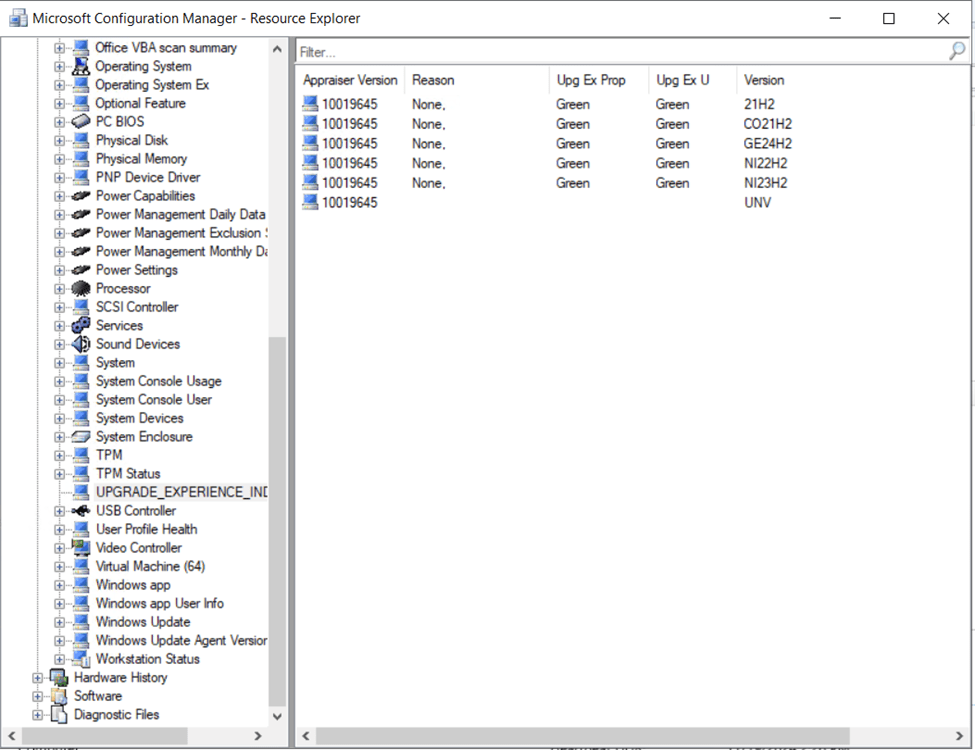 You can view the upgrade compatibility data for any single Windows 10 device by navigating to the device in the Configuration Manager console, right-clicking the device and selecting Start > Resource Explorer.