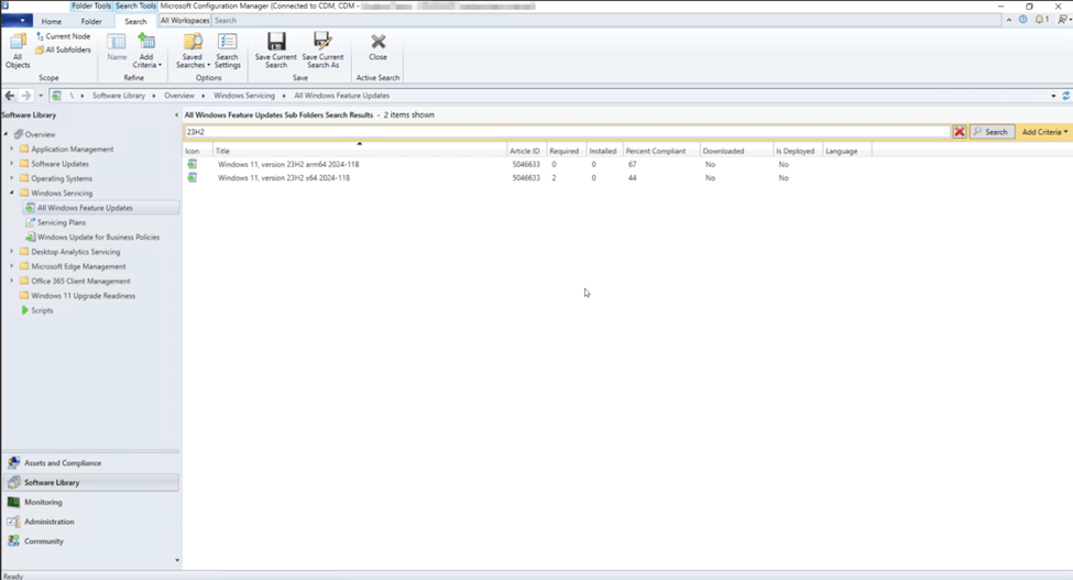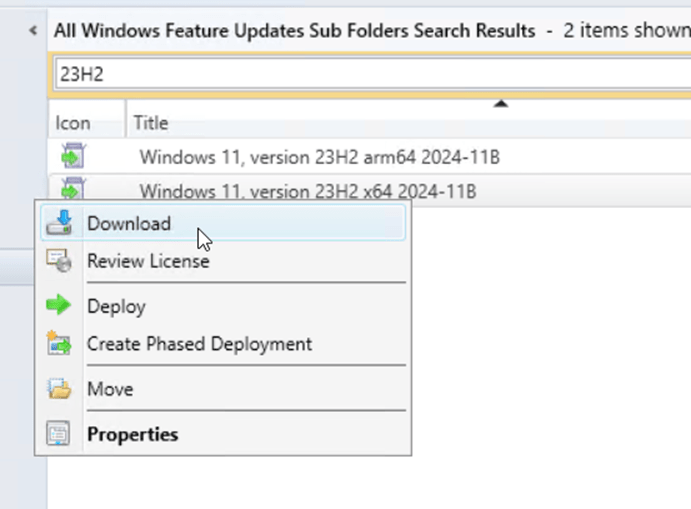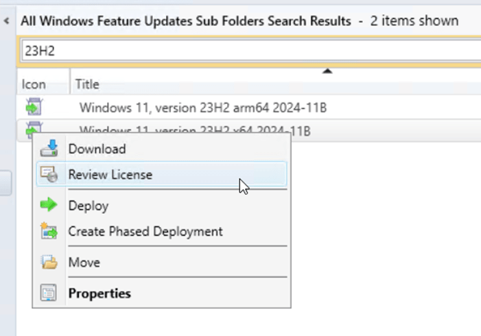 In the search bar, enter 23H2 then click Search. Two results should show up if the Software Update Point configuration is correct and a synchronization has occurred since the Windows 11 product and Updates classifications were added to the configuration.
