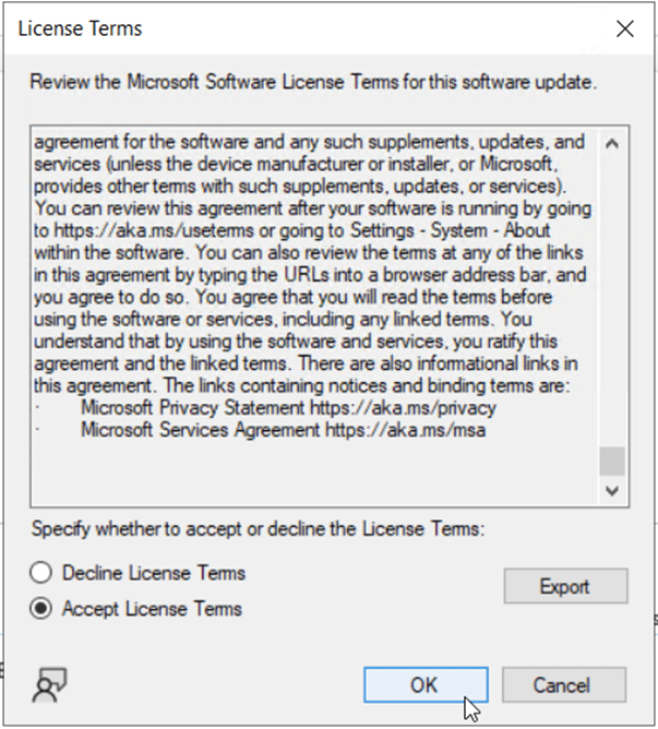 Select the Accept License Terms radio button, if you agree to the terms, then click OK.