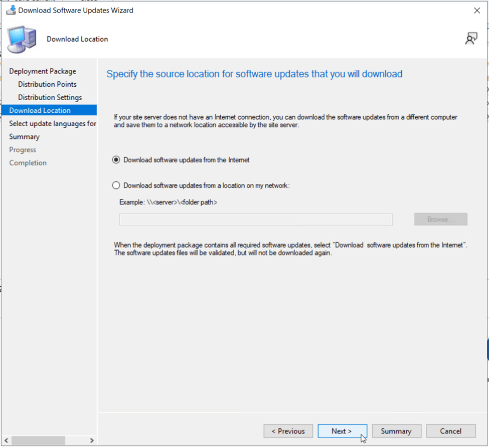 On the Download Location page, leave Download software update from the Internet checked.