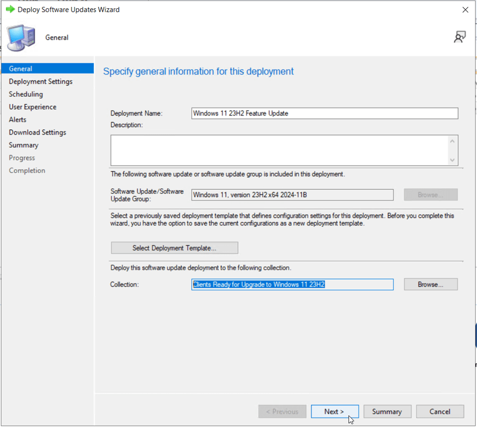 On the General tab of the Deploy Software Updates wizard, specify a Name and Description. A Software Update/Software Update Group will be automatically created for you. Under target collection, specify a pilot collection of Windows 11 23H2 ready client devices (We created this earlier in the preparation steps, “Clients Ready for Upgrade to Windows 11 23H2”).
